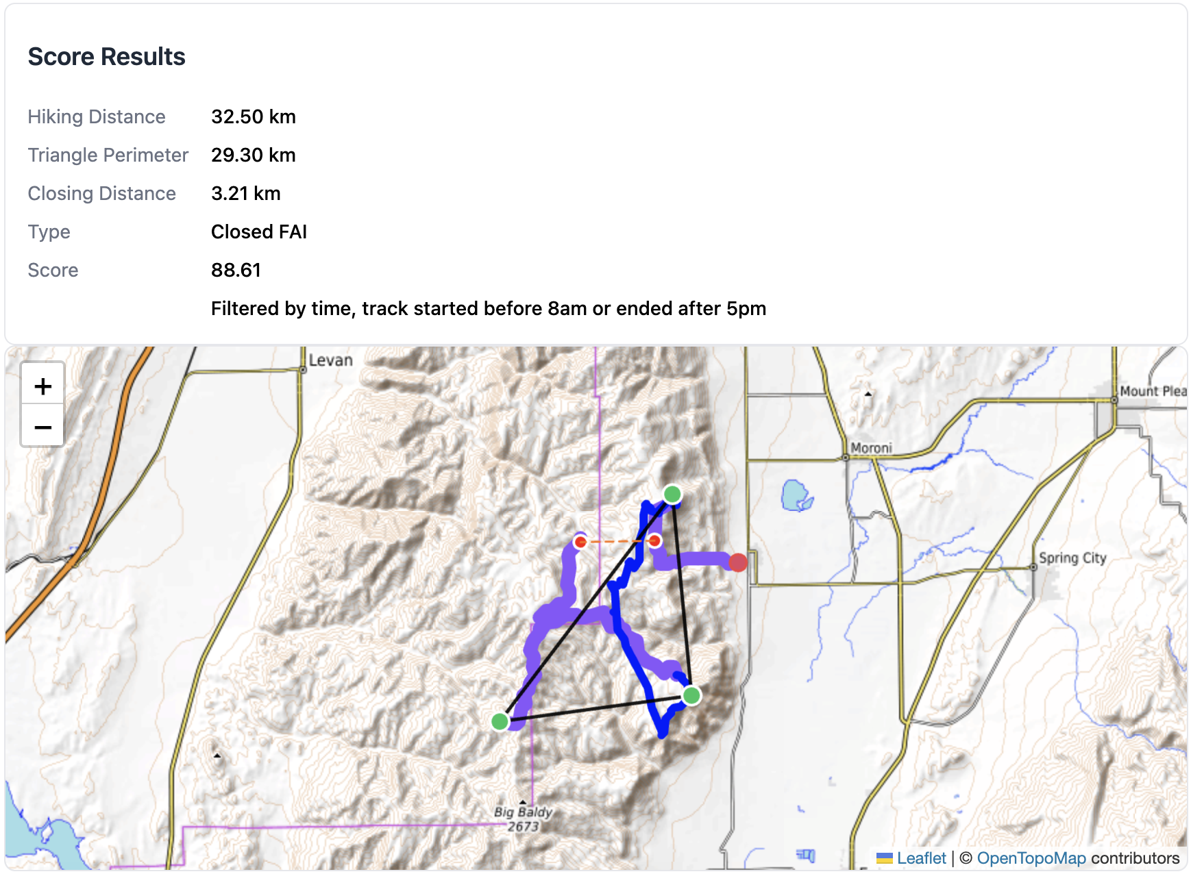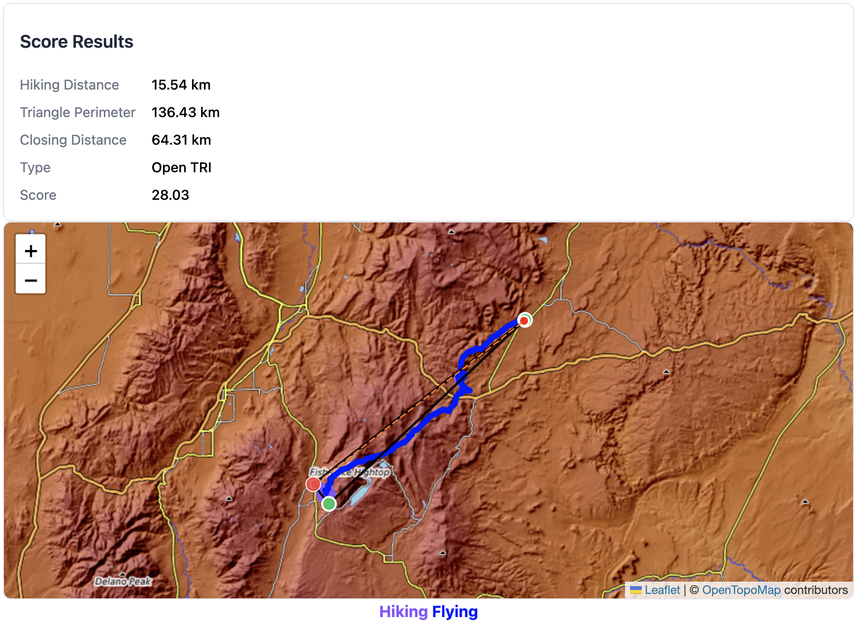 The total distance hiked is computed from the tracklog during portions when the pilot was on the ground. One point is added to the score for each km hiked. All distance hiked counts towards the score, not just hiking that contributes towards triangle turnpoints.
